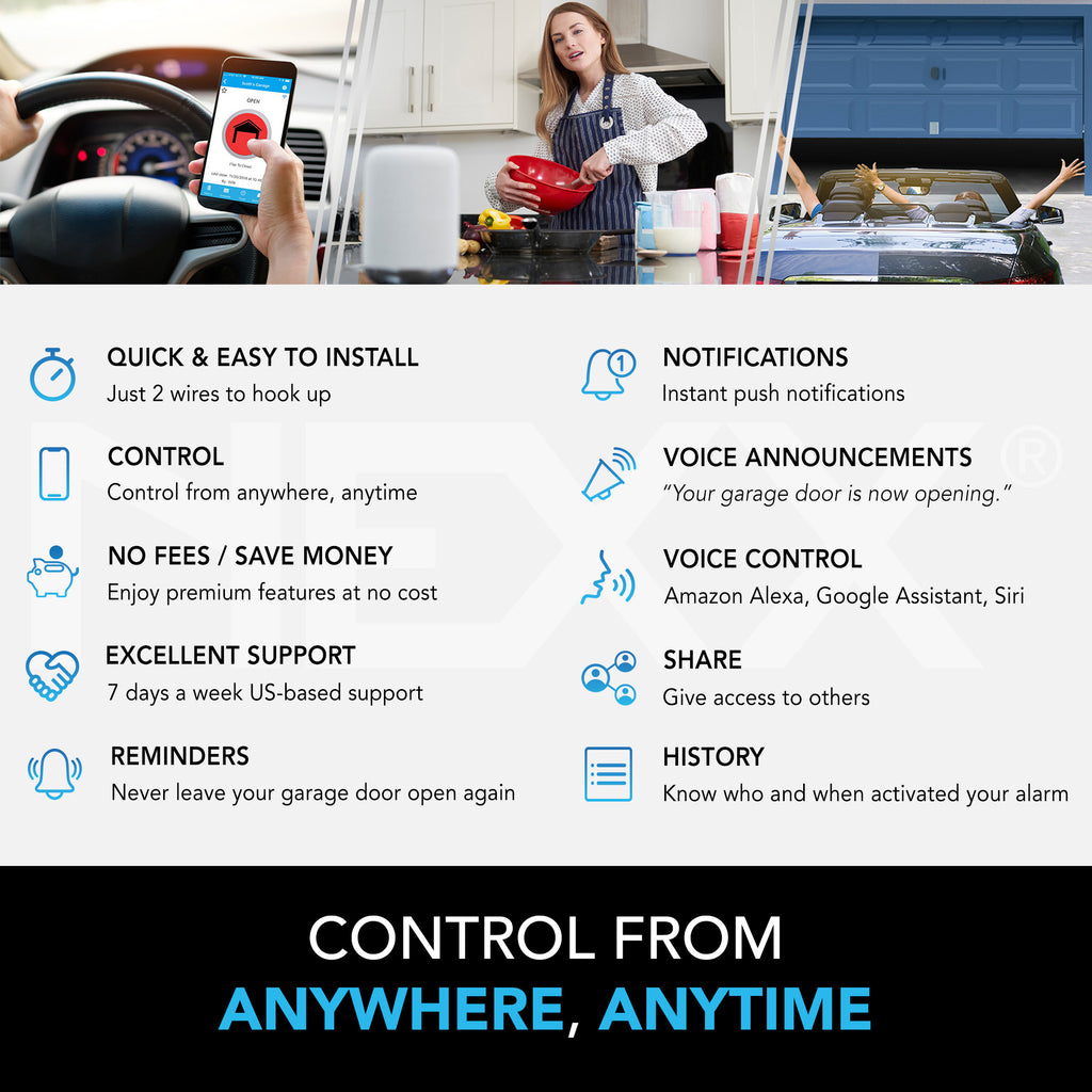 By adding Nexx Smart Garage to your existing garage opener, a world of easy-to-use high-tech smart features are at your fingertips.